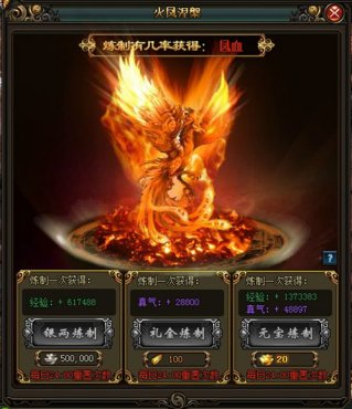 不知道各位親們,有沒有注意到熔爐旁“火鳳”這一標誌呢?通過銀兩,禮金,元寶煉製可以獲得經驗,真氣。還有機會歷練出鳳血。使用鳳血後,人物立馬飆升一級,這對於後期升級困難的親們可是一大福音啊!